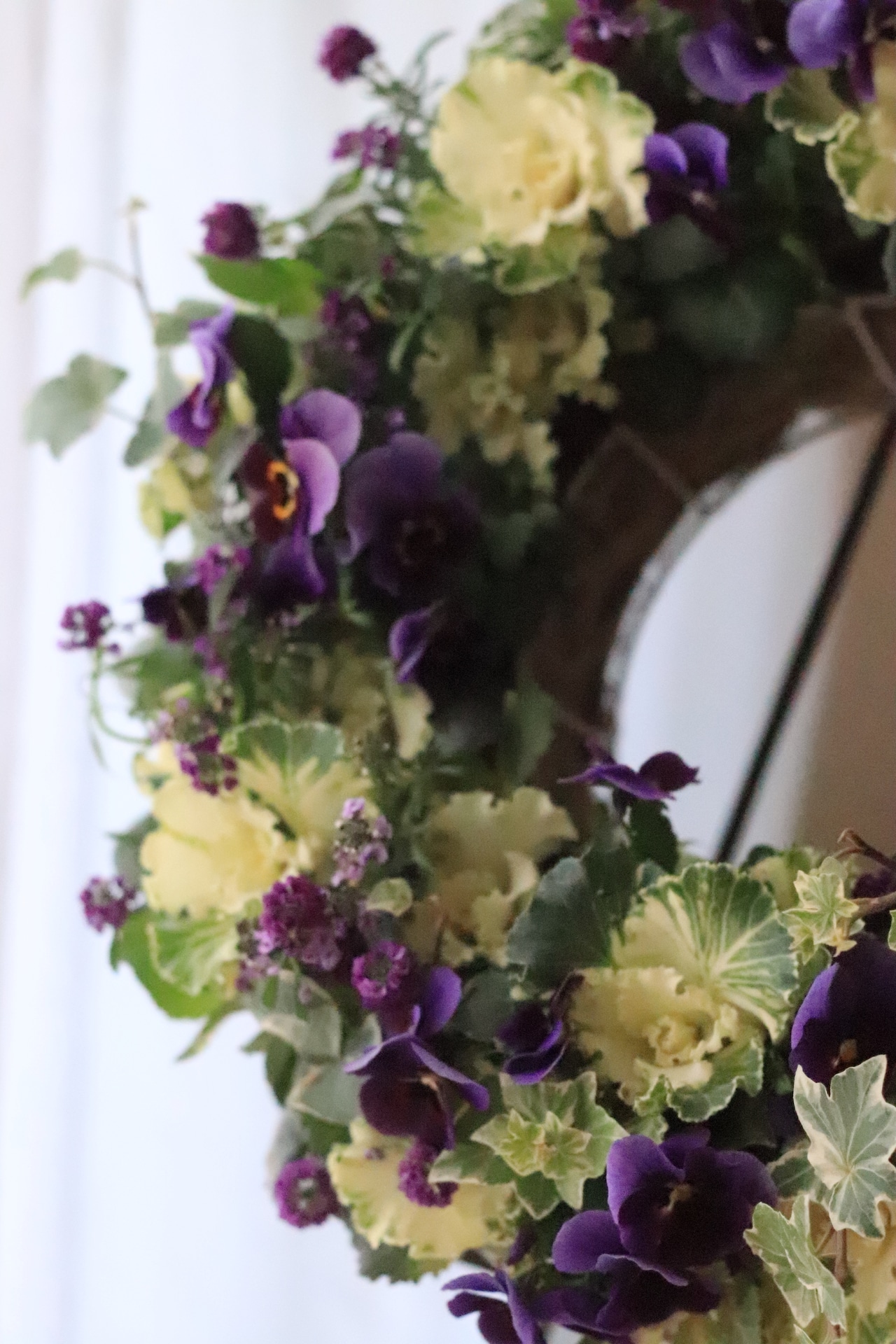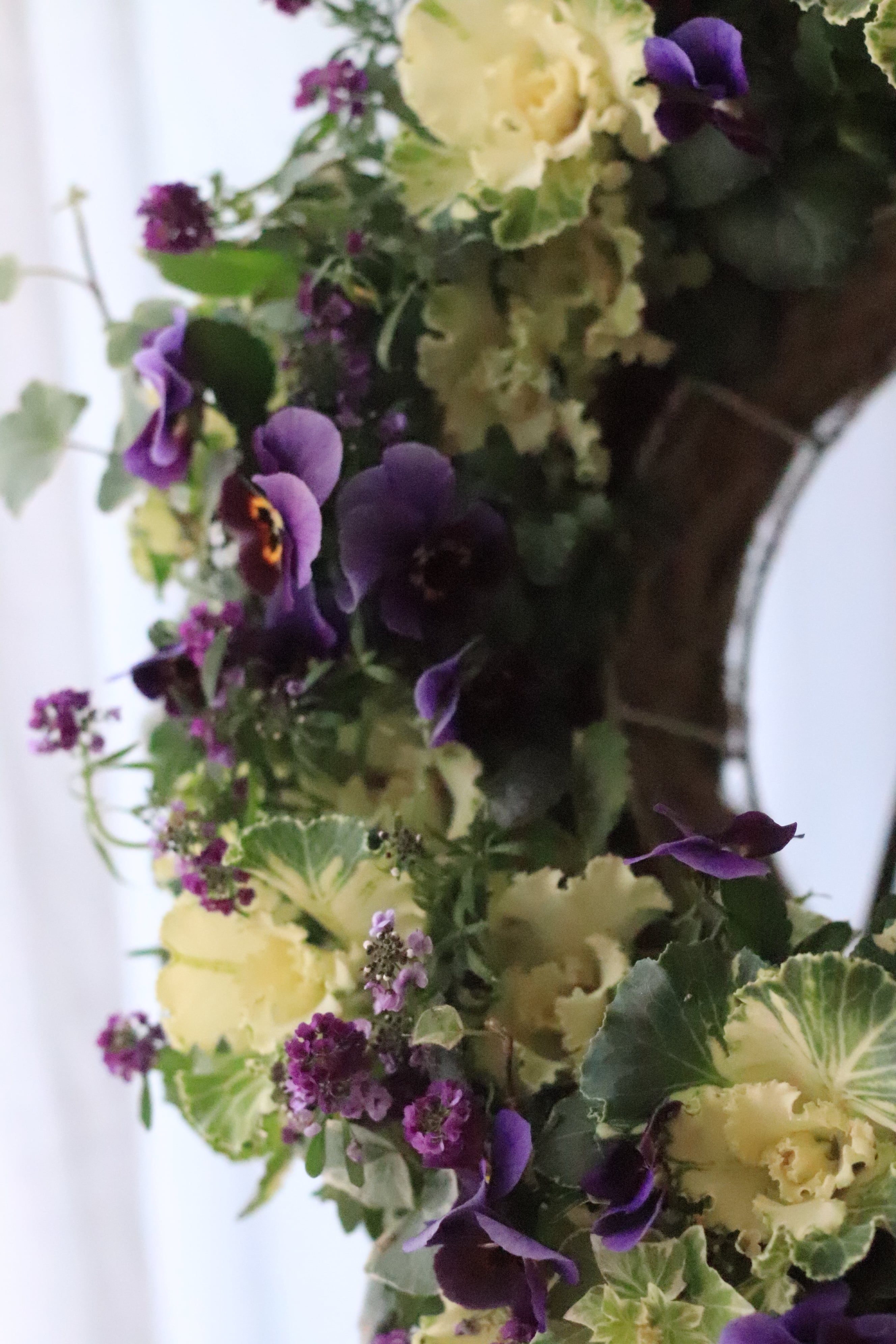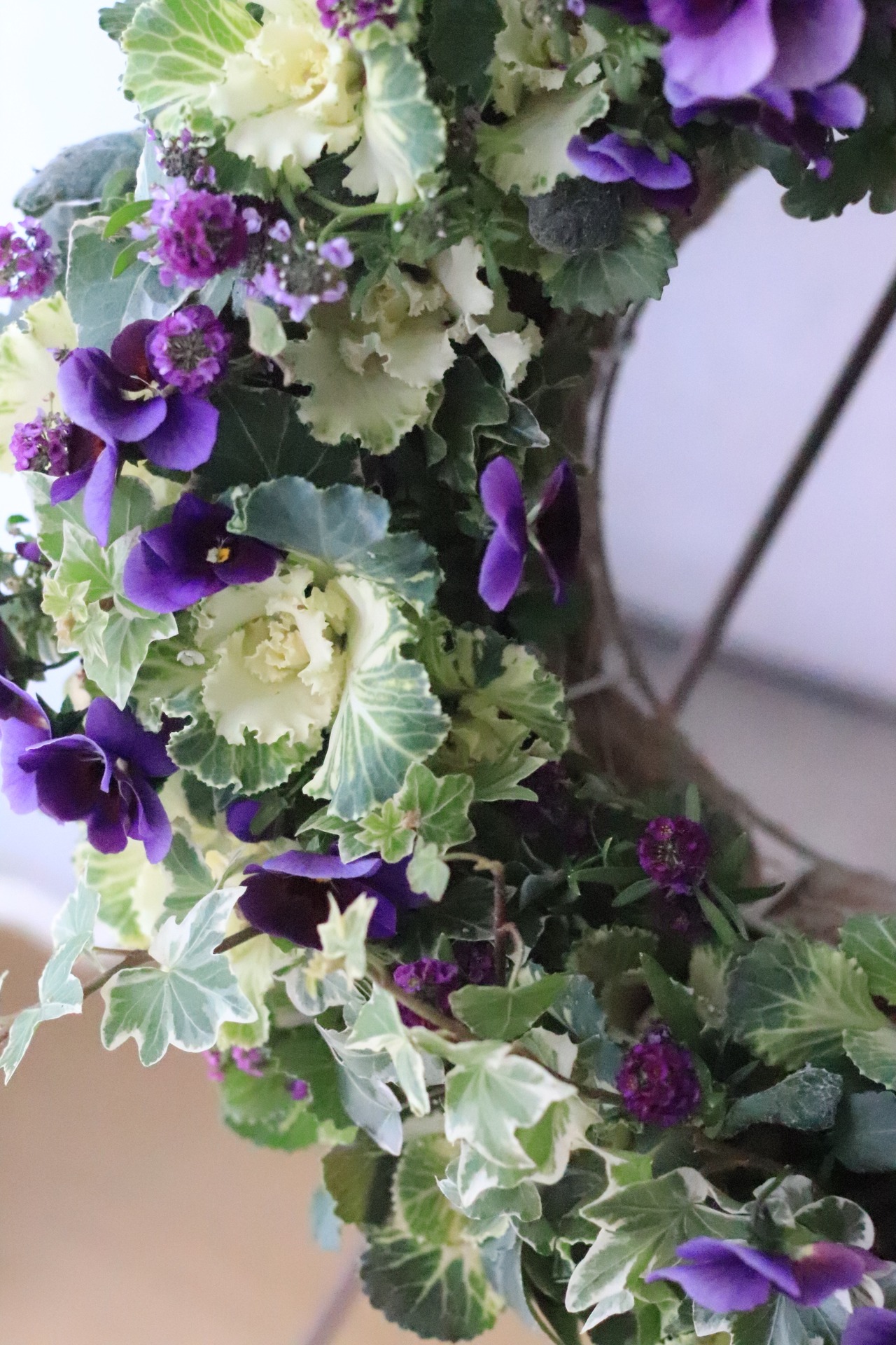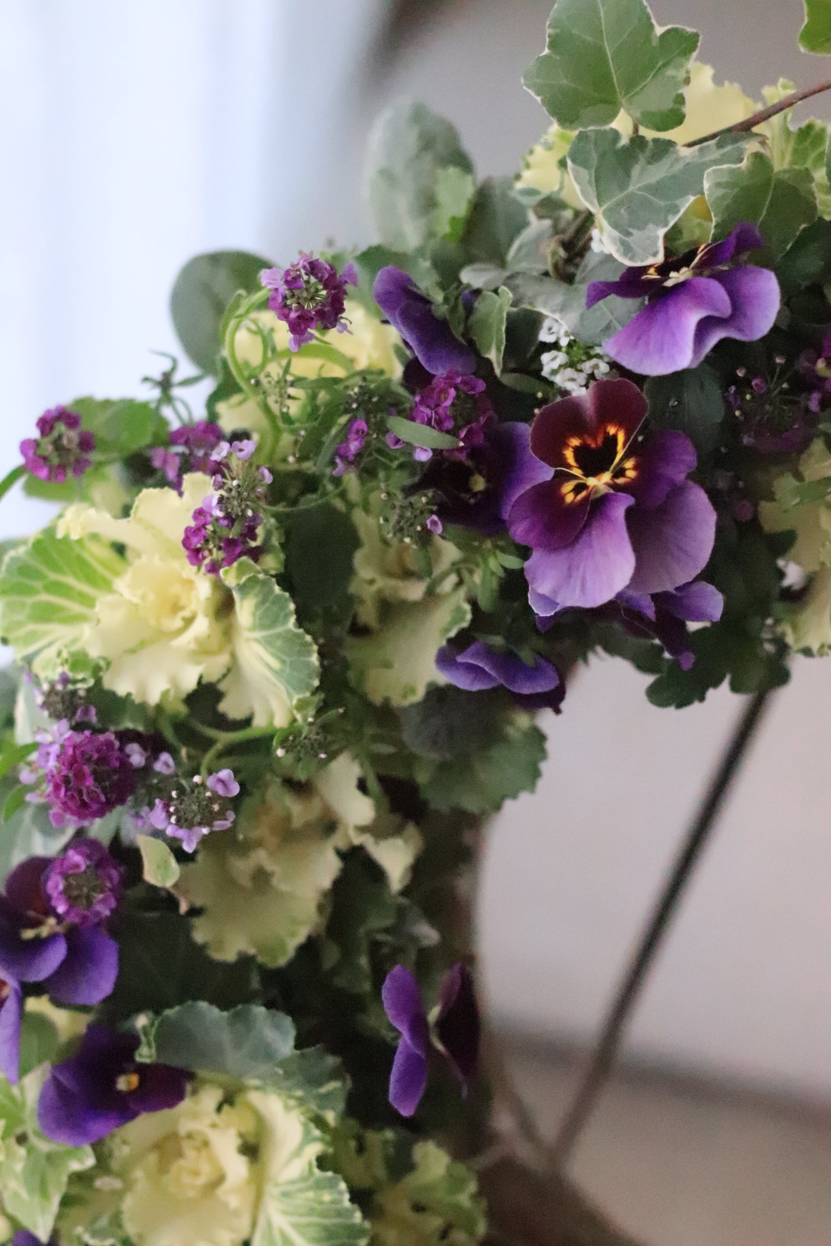 白い葉牡丹と紫のビオラぶどうももかのブリコラージュリースです
