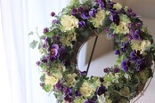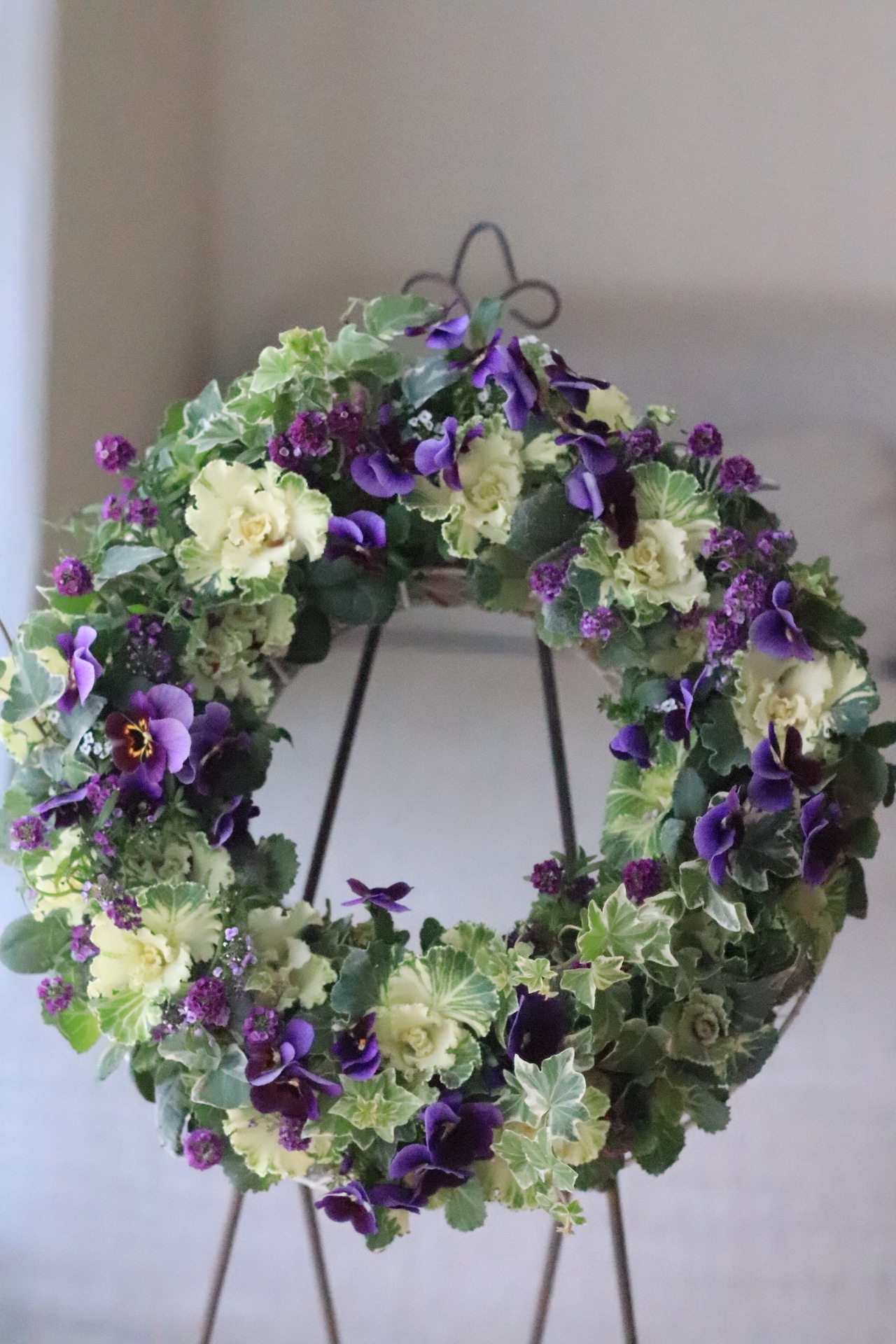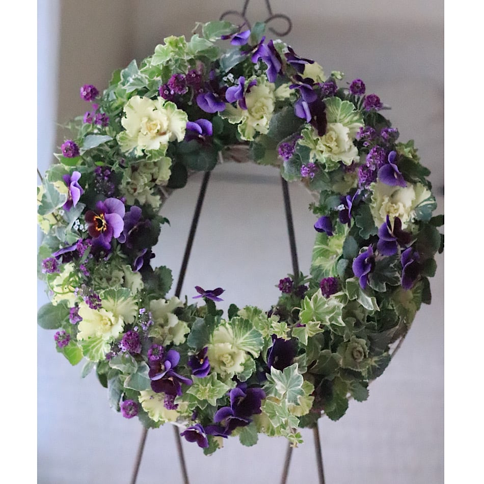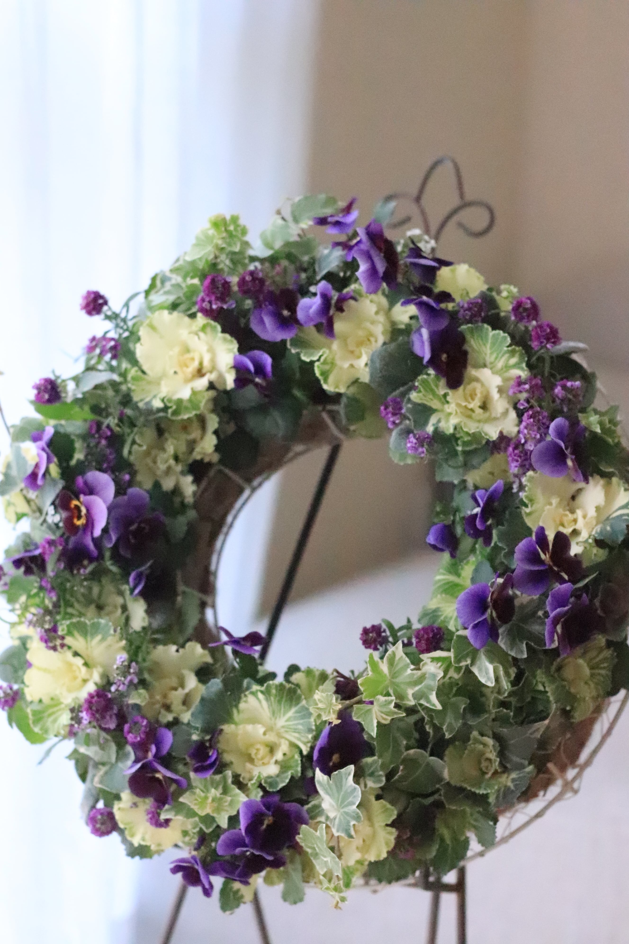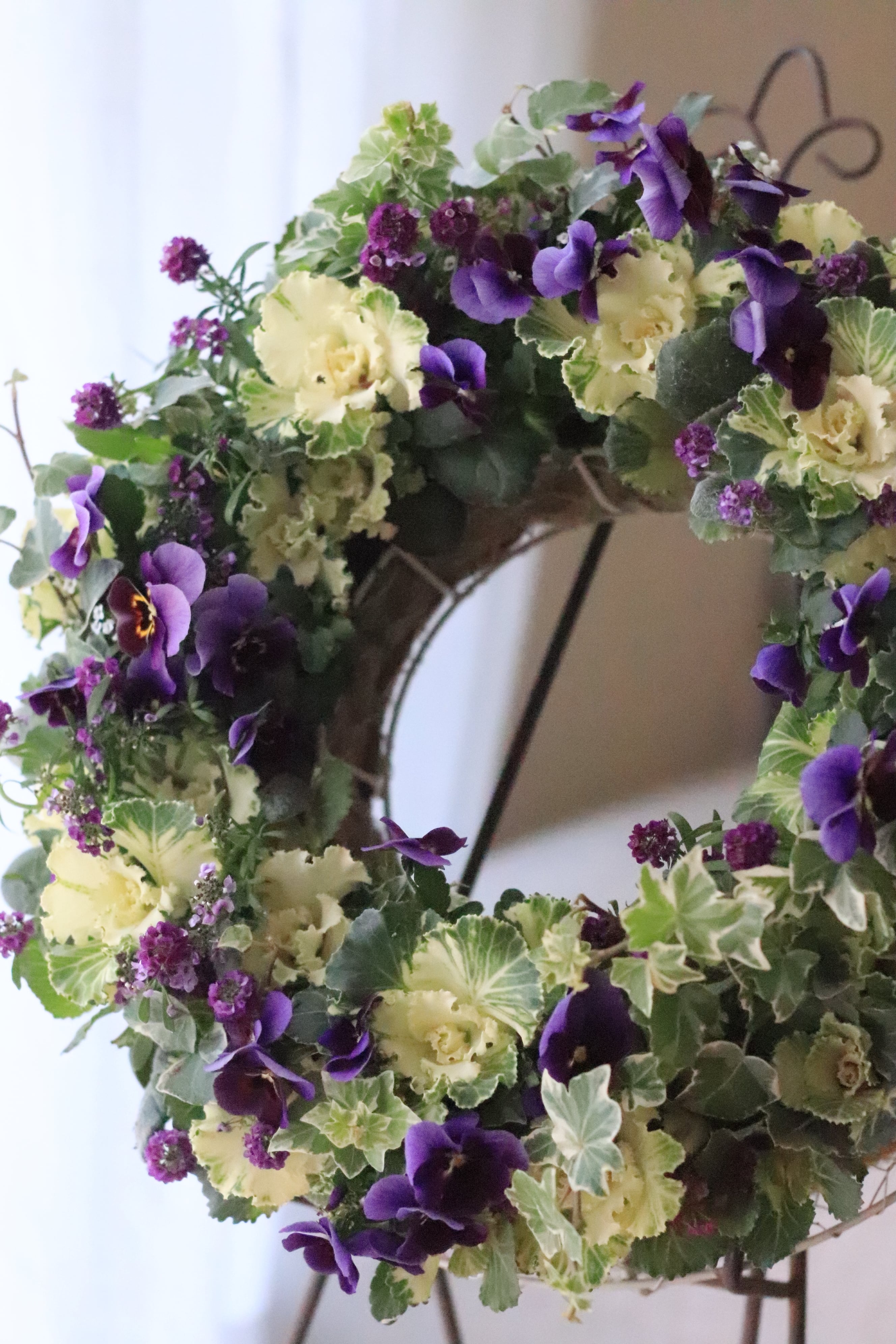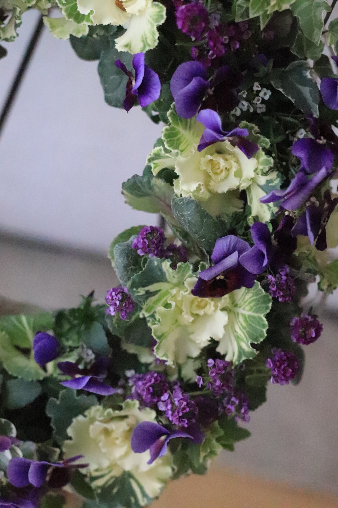 白い葉牡丹と紫のビオラぶどうももかのブリコラージュリースです