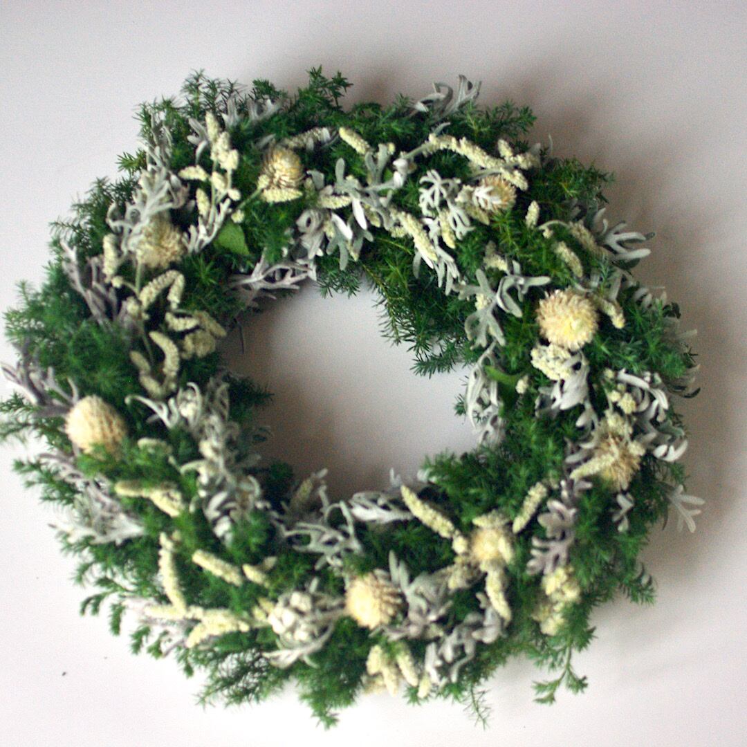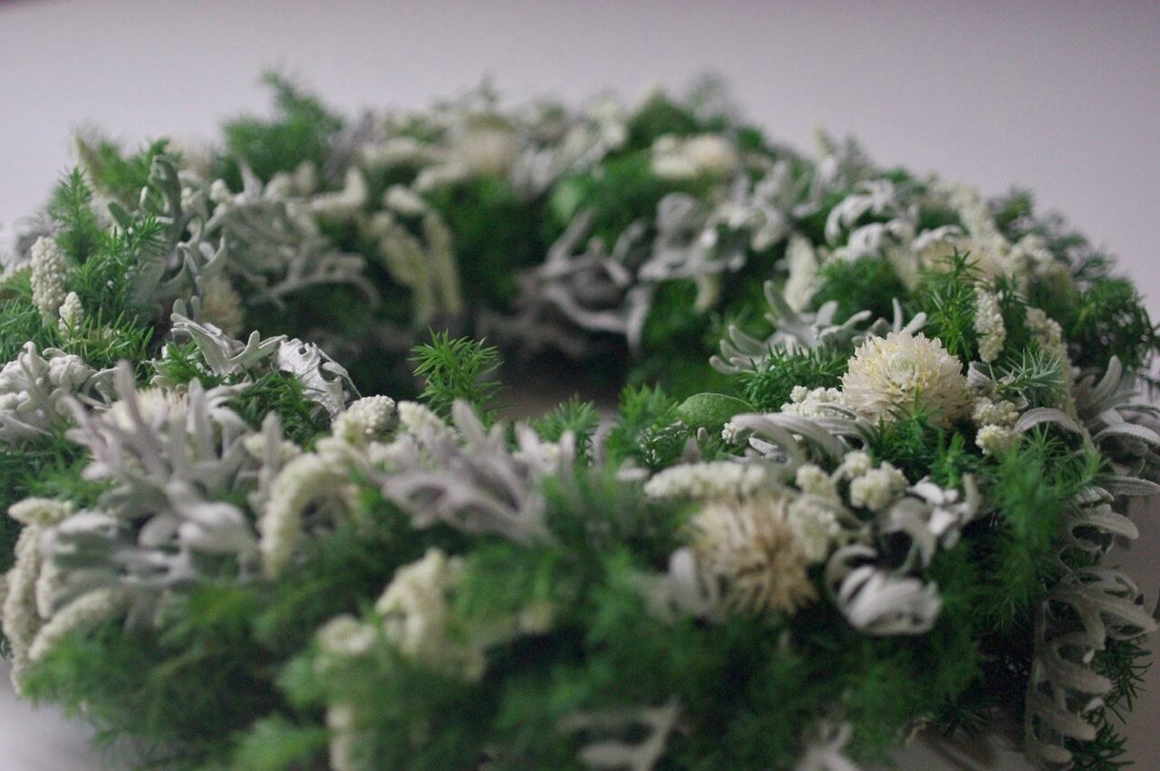 シルバーキャットのフワフワと千日紅で可愛らしさをプラスしたホワイトリース