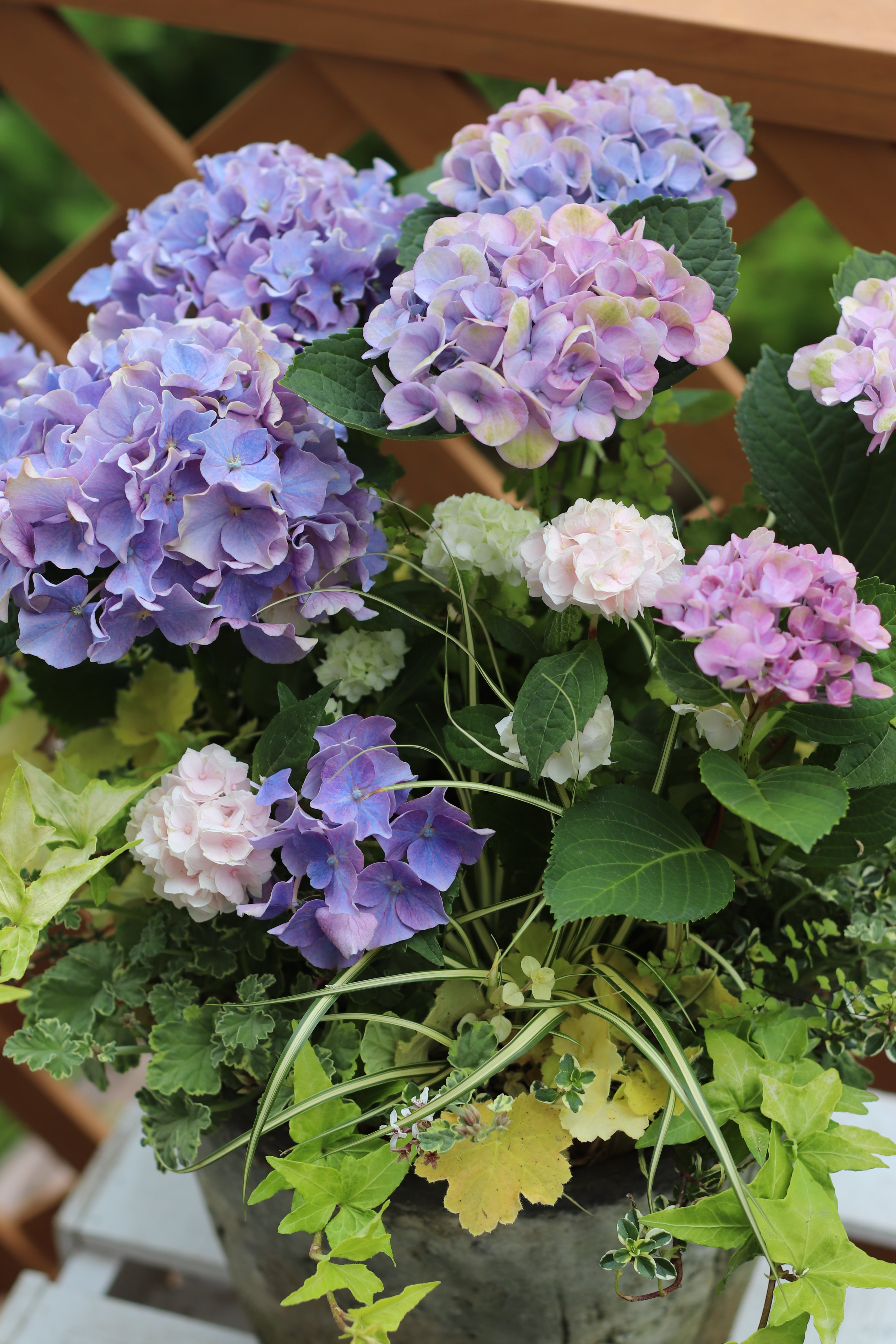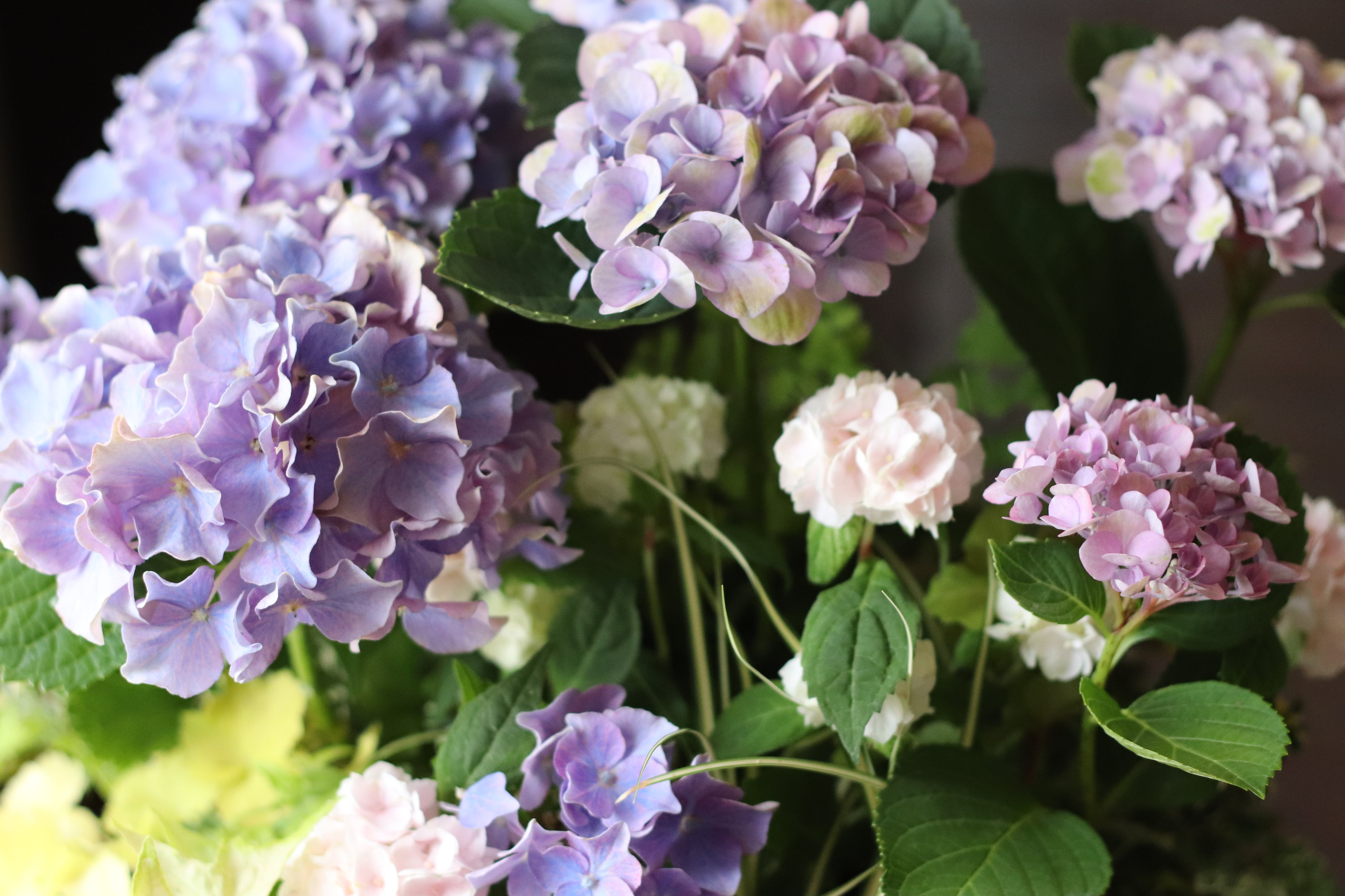 器と紫陽花の色を合わせてアンティークな雰囲気に仕上がりました