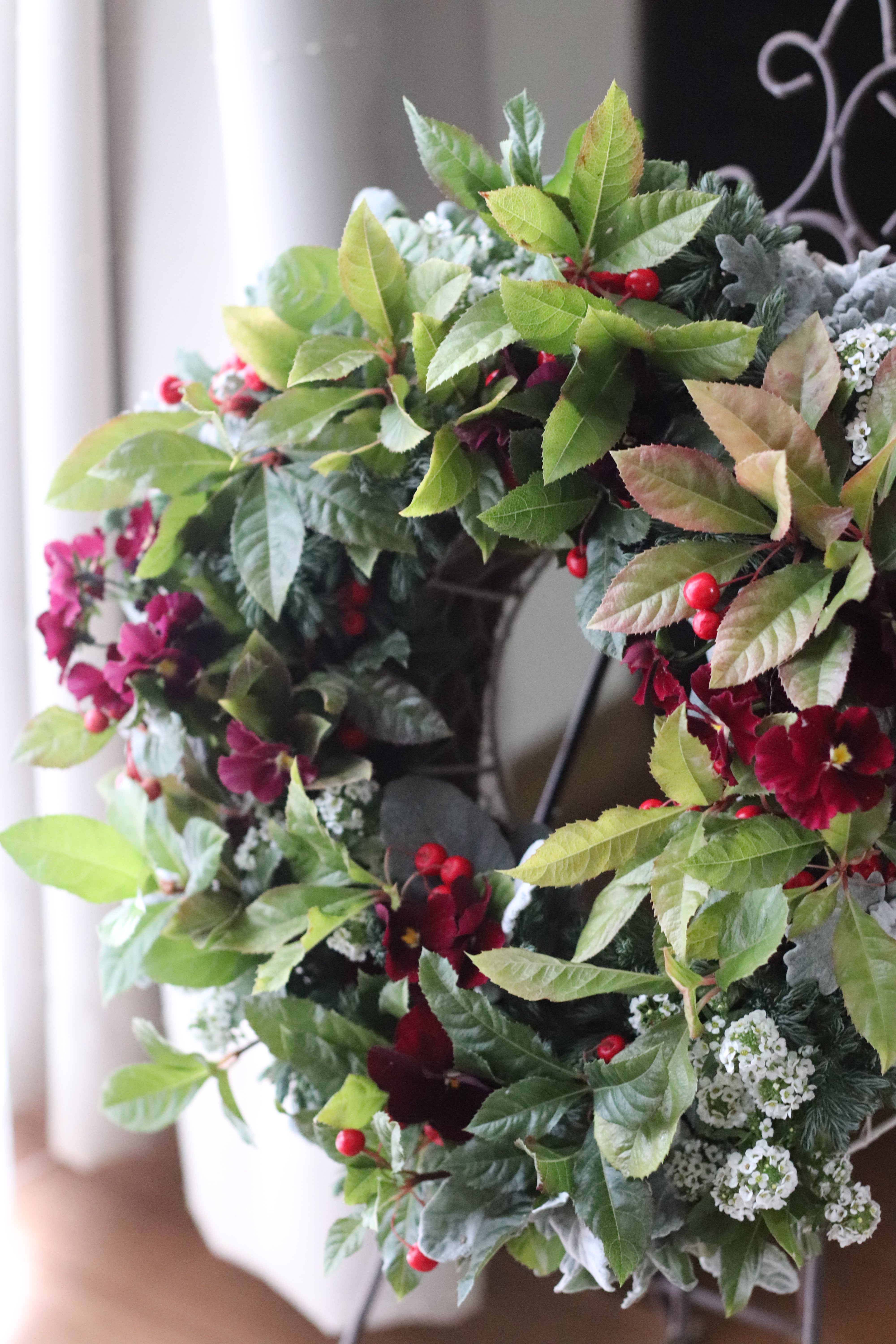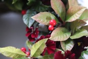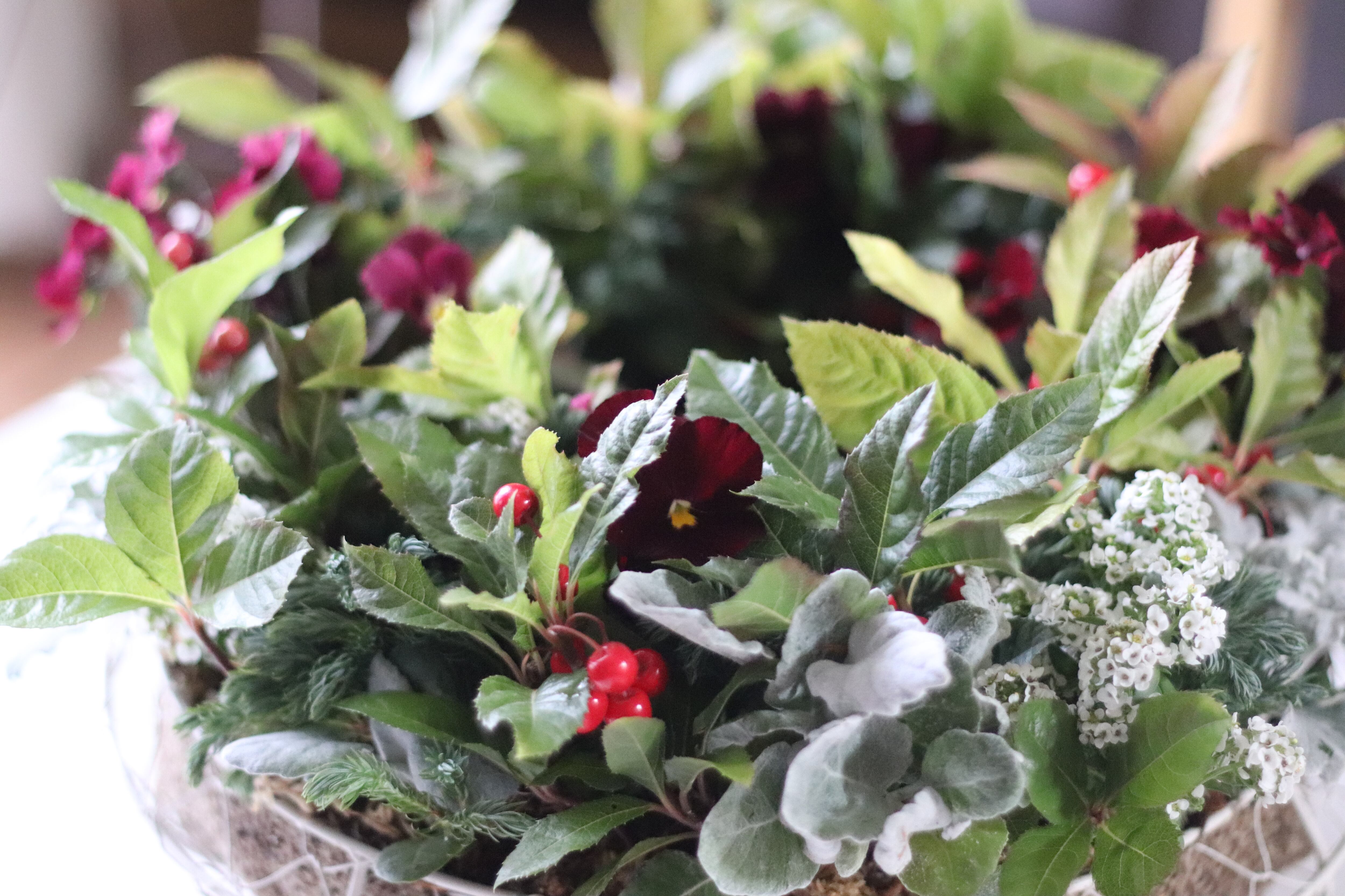 ヤブコウジとビオラの新春ブリコラージュリース