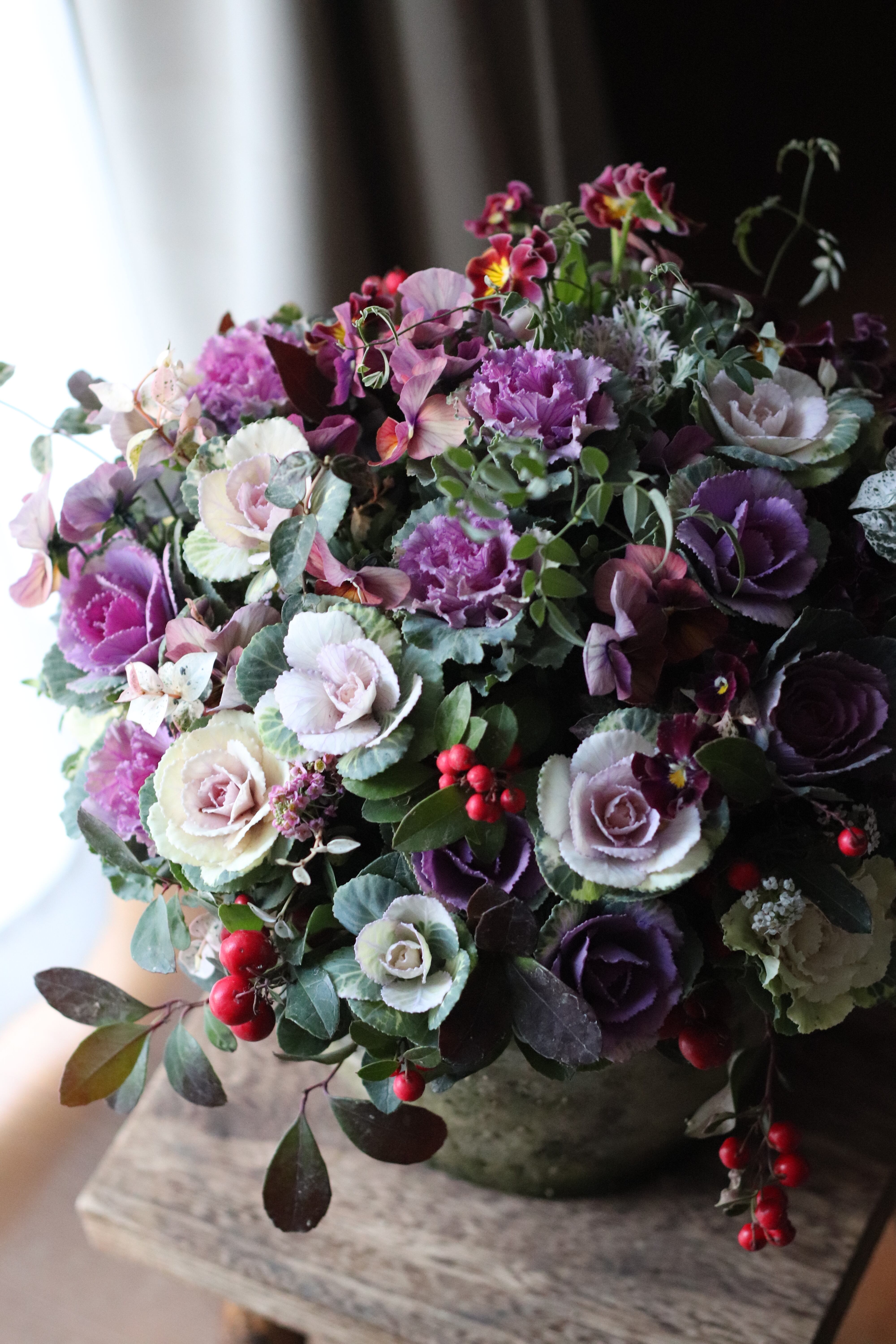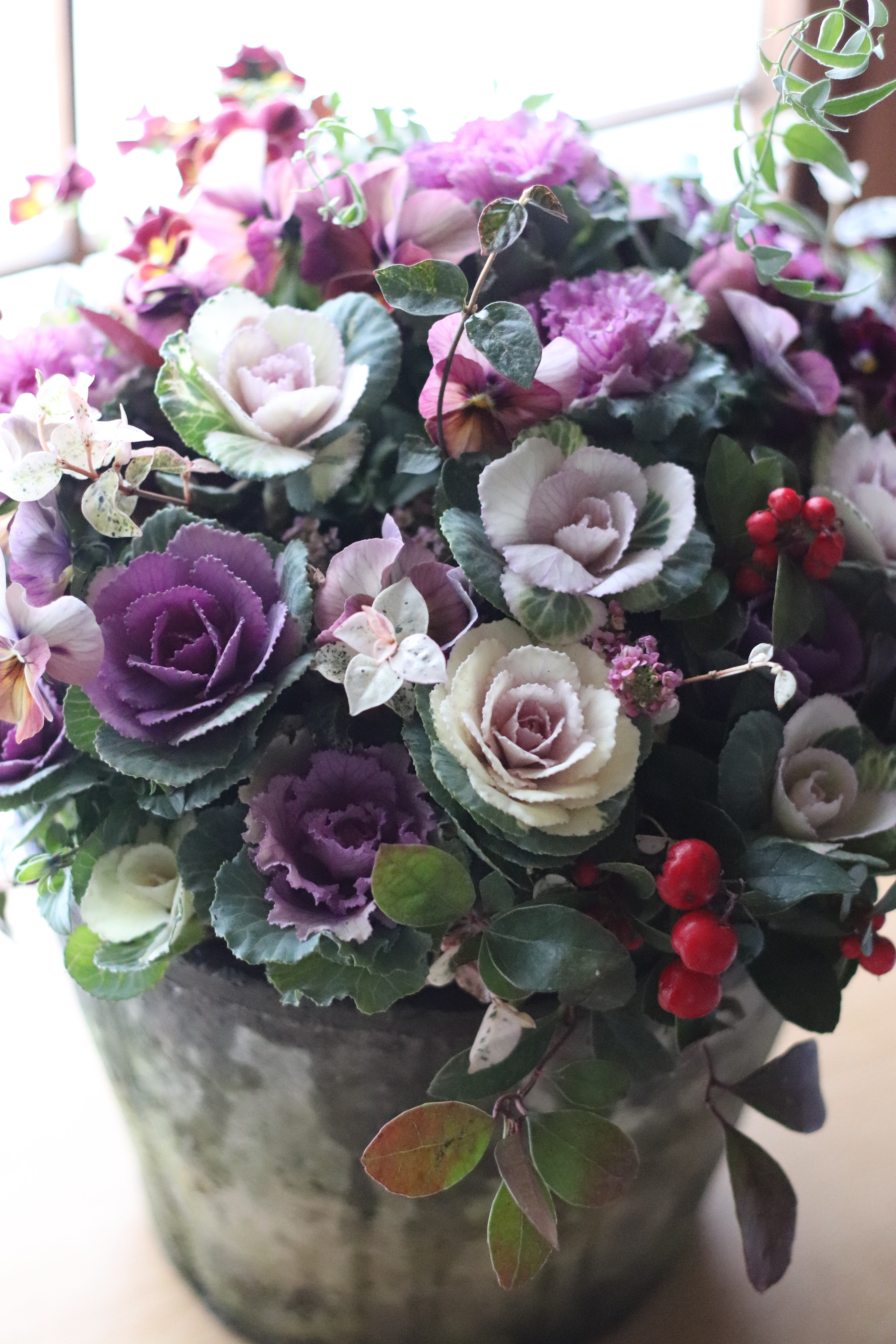 アンティークカラーのビオラと葉牡丹のマウントブリコラージュ