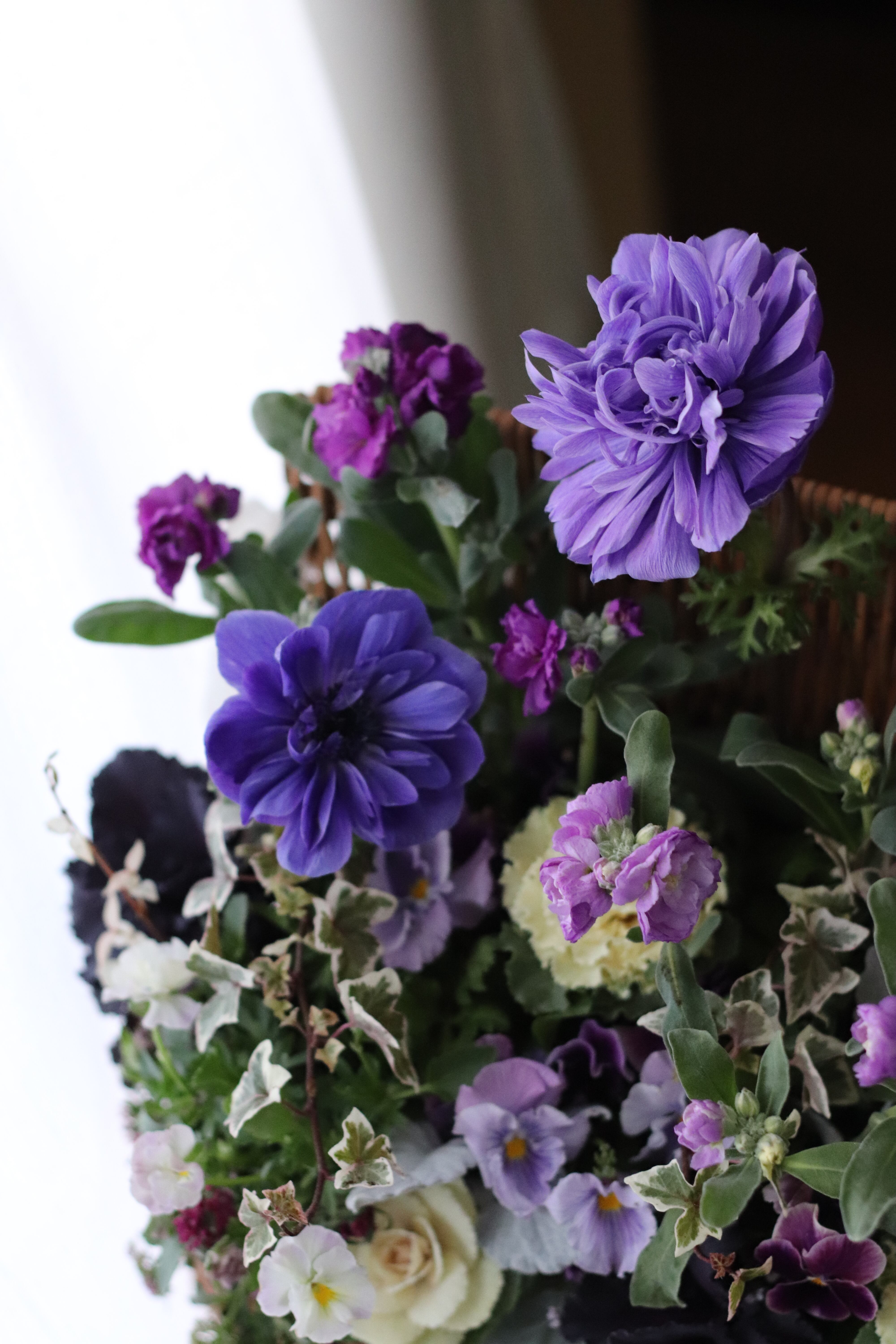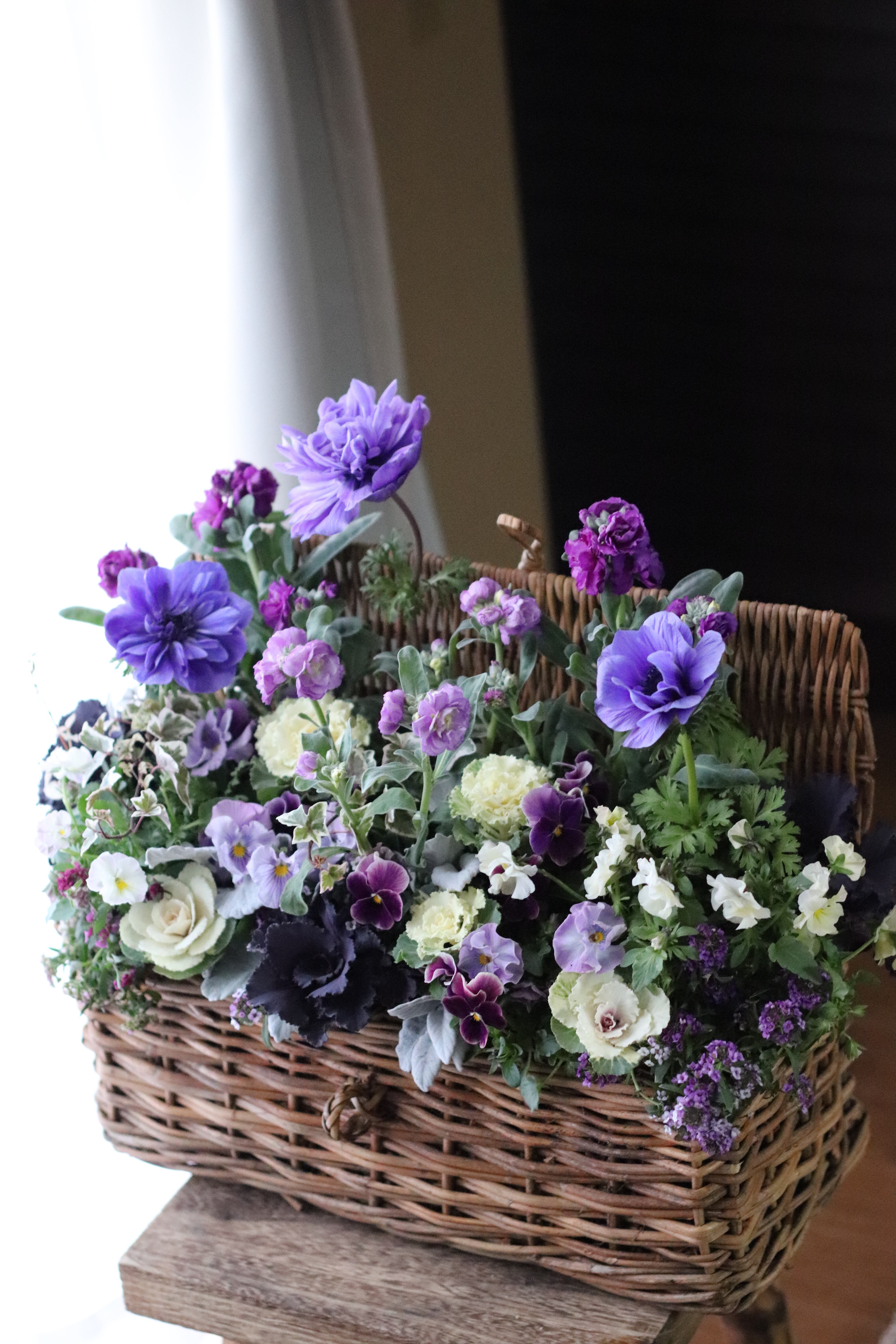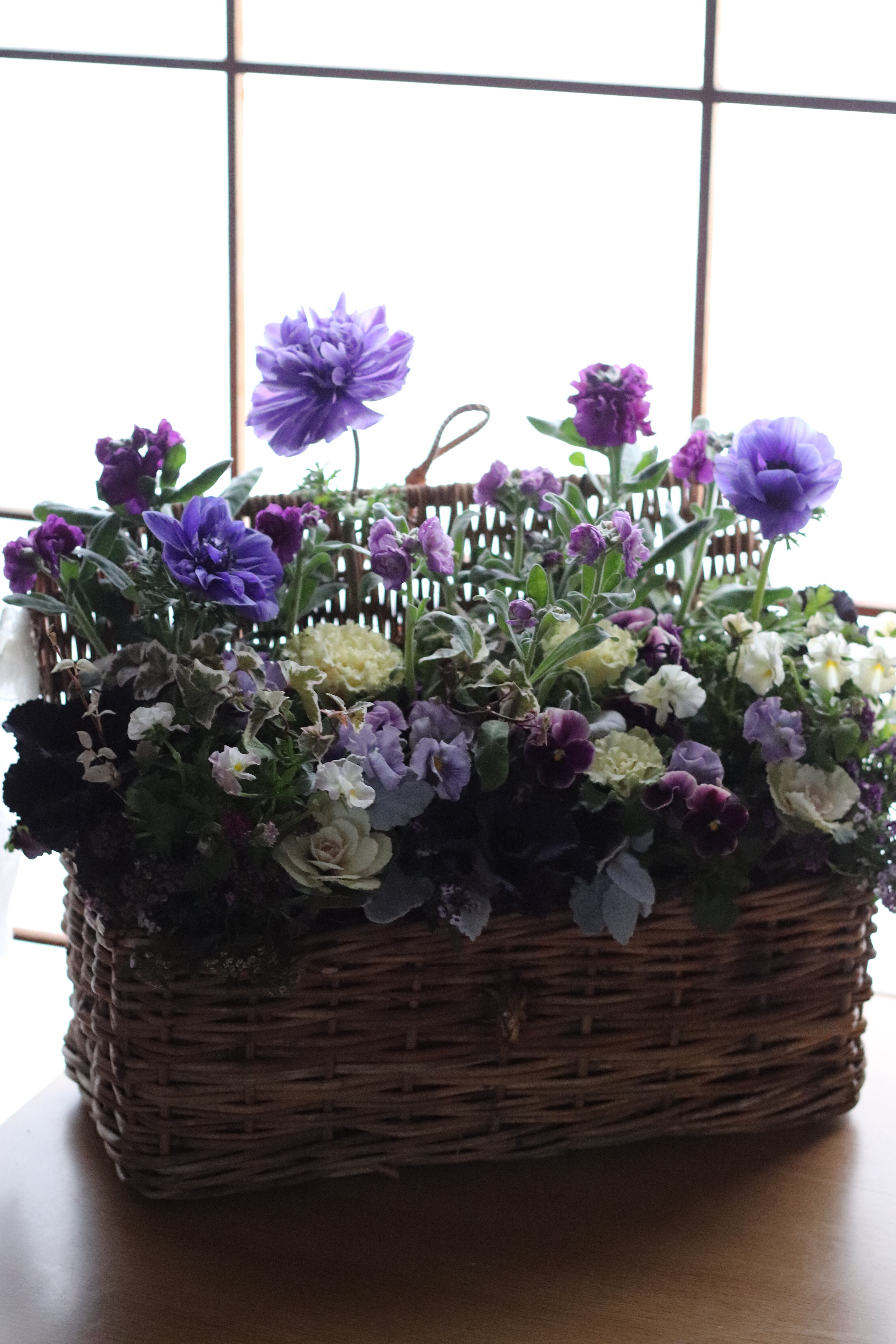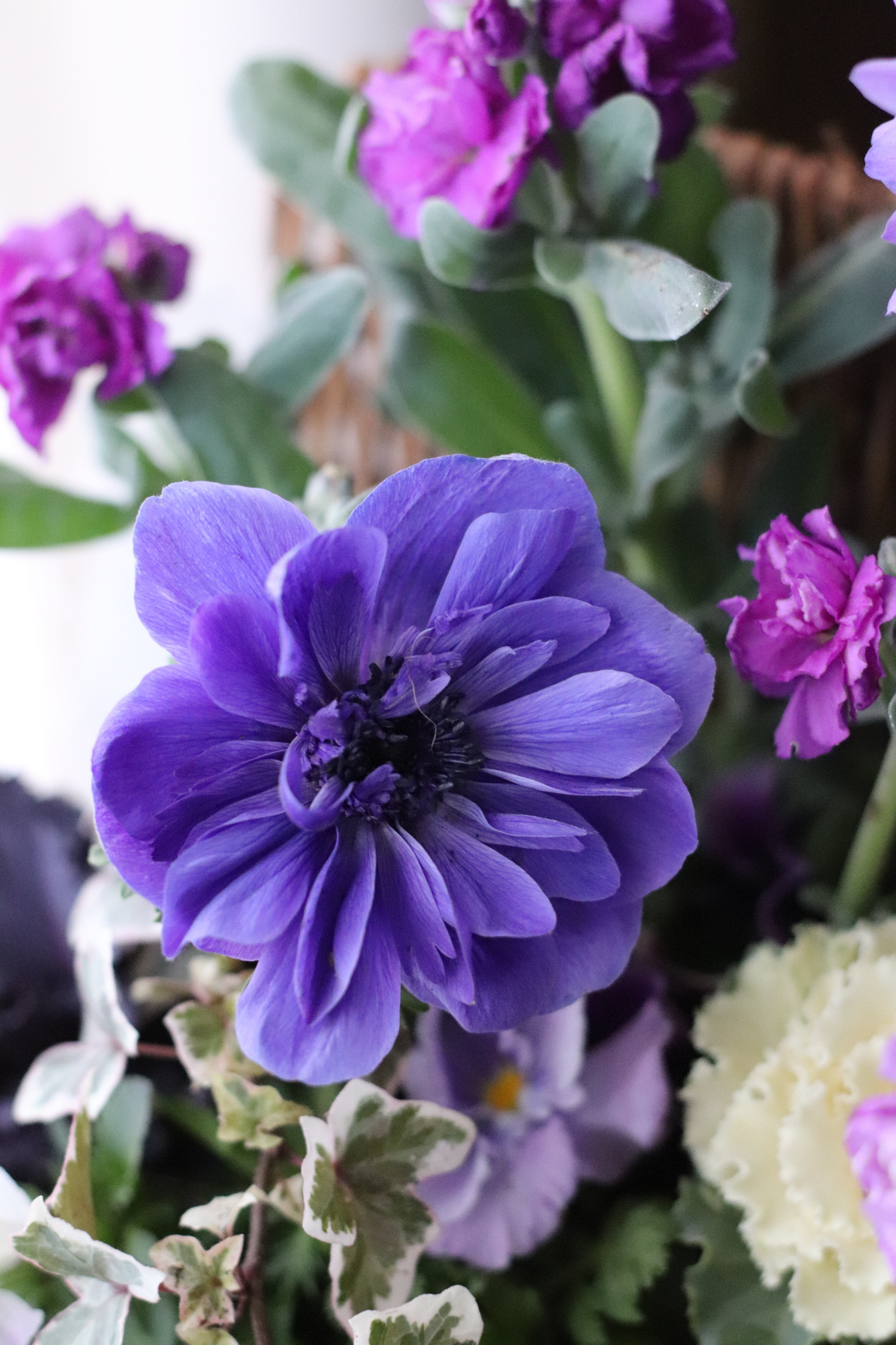 青みがかったパープルのアネモネが素敵なブリコラージュフラワーです