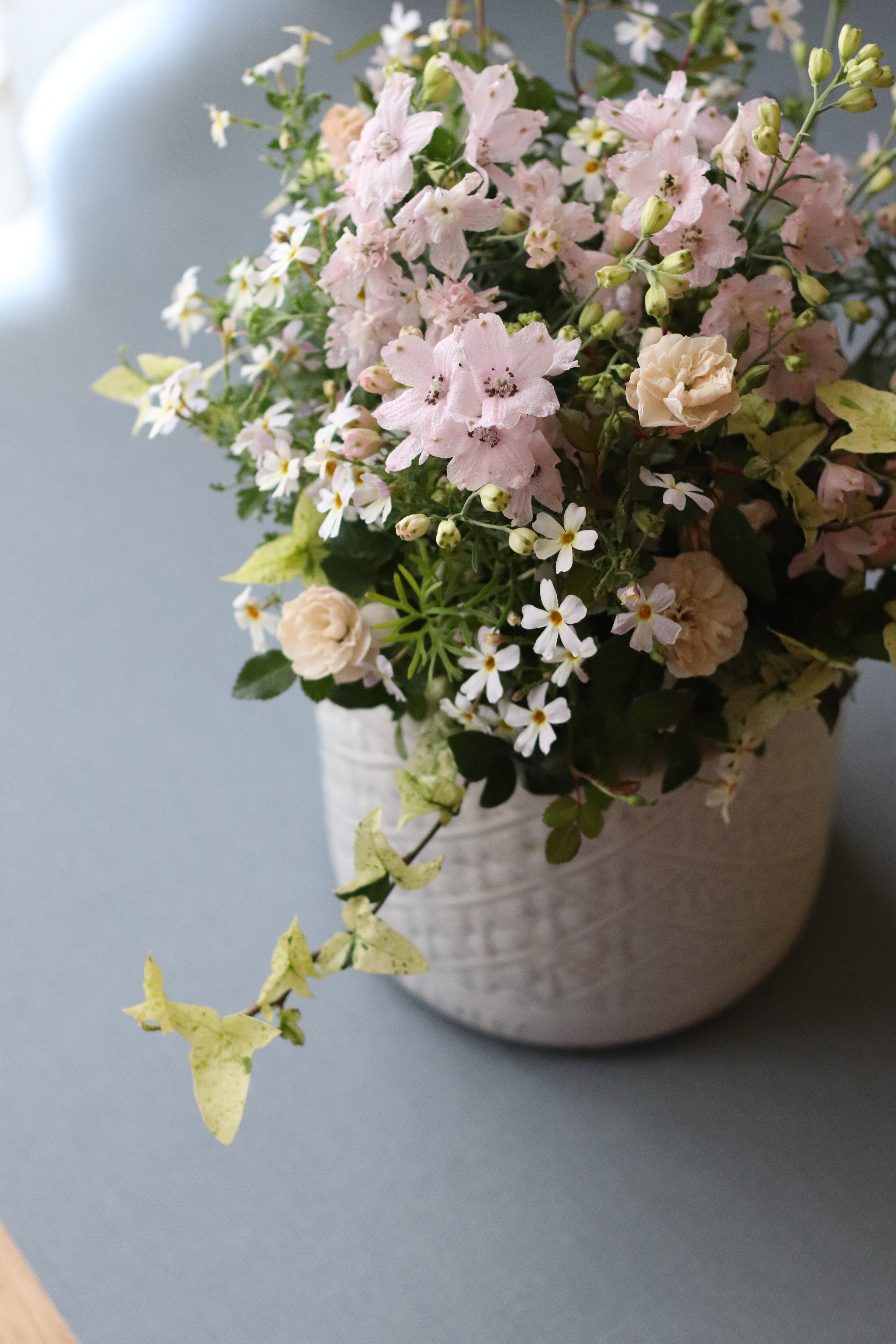 ピンクのデルフィニウムがふわふわと可愛いブリコラージュです